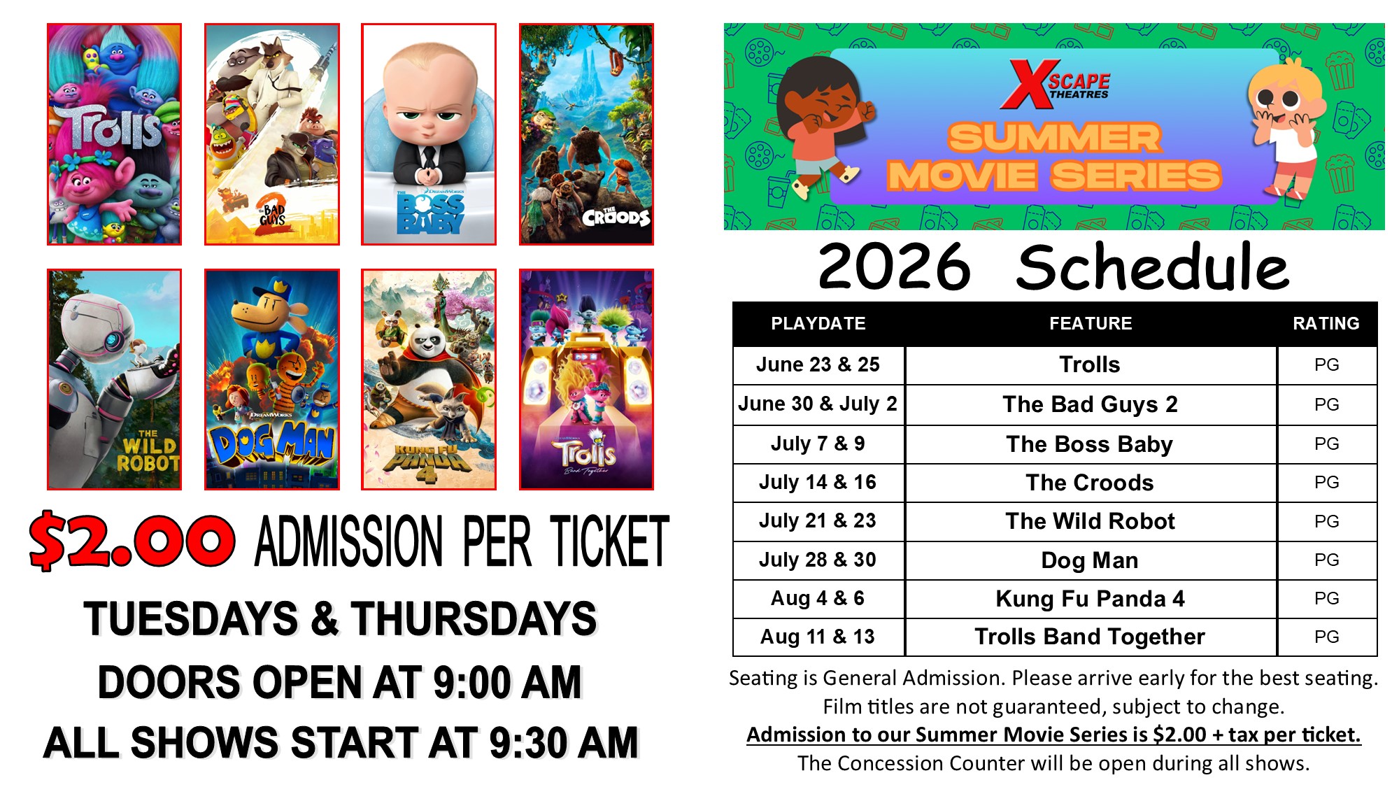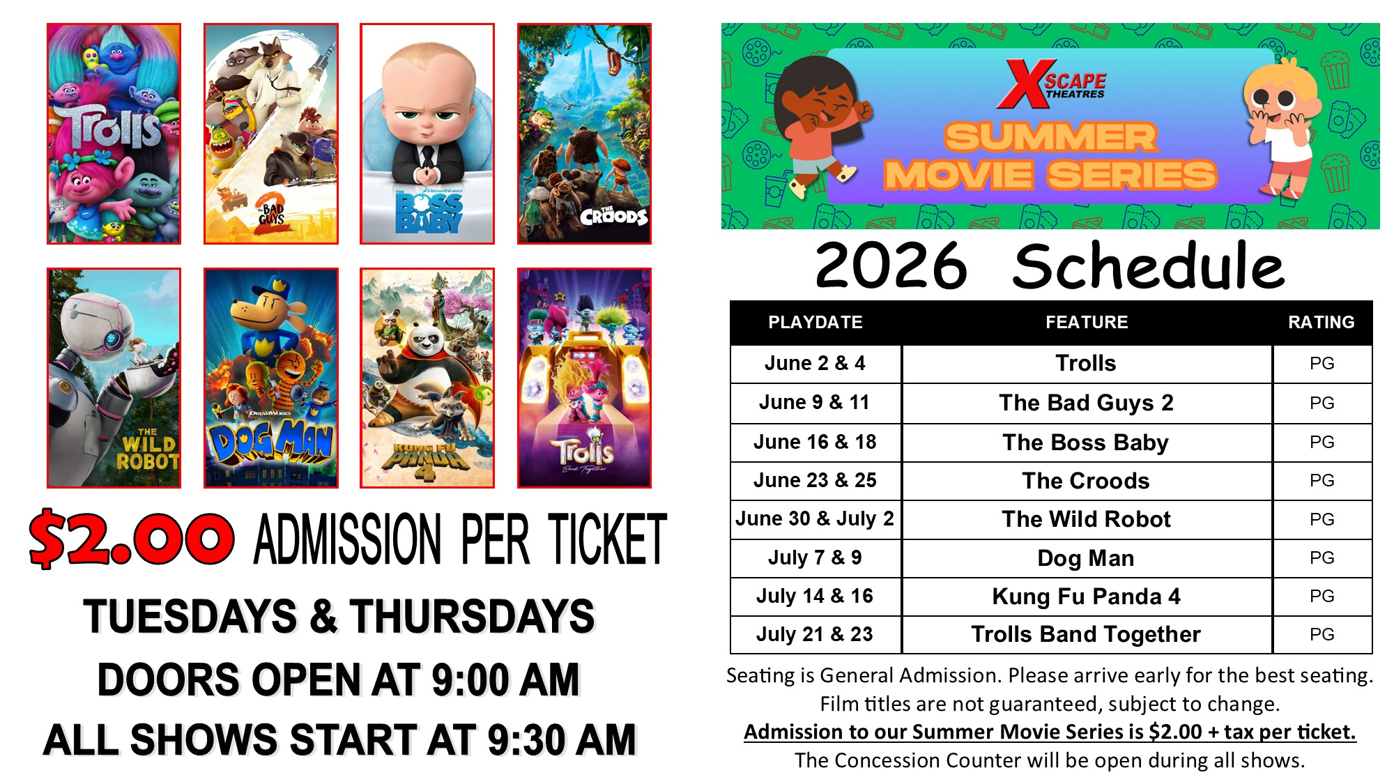 A special $6.00 Summer Combo (Popcorn & Drink) will be available for purchase until 10:00 AM every show day.